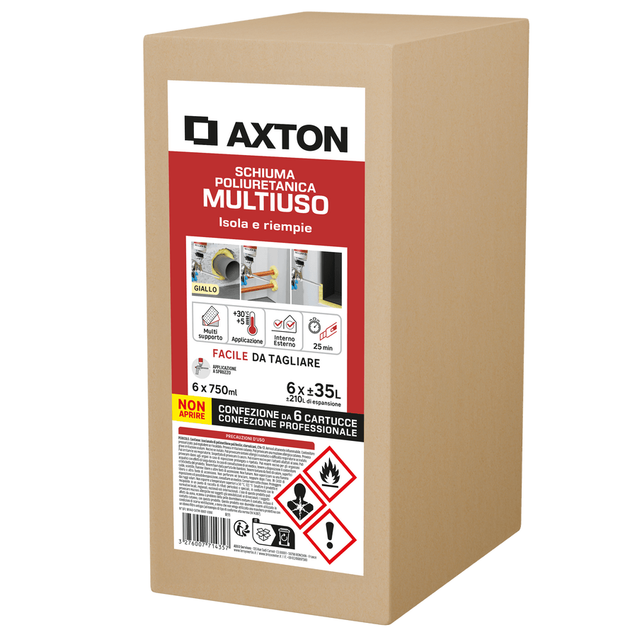 SET OF 6 PIECES MULTI-USE POLYURETHANE FILLING FOAM FOR AXTON PISTOL 750MLE' ideal for insulating against temperature variations and noise on all types of surfaces: jambs, windows, walls, etc., both indoors and outdoors. It can be used to seal cavities (cracks, holes around pipes, cutouts, etc.) and fix components (sockets, switches, etc.).