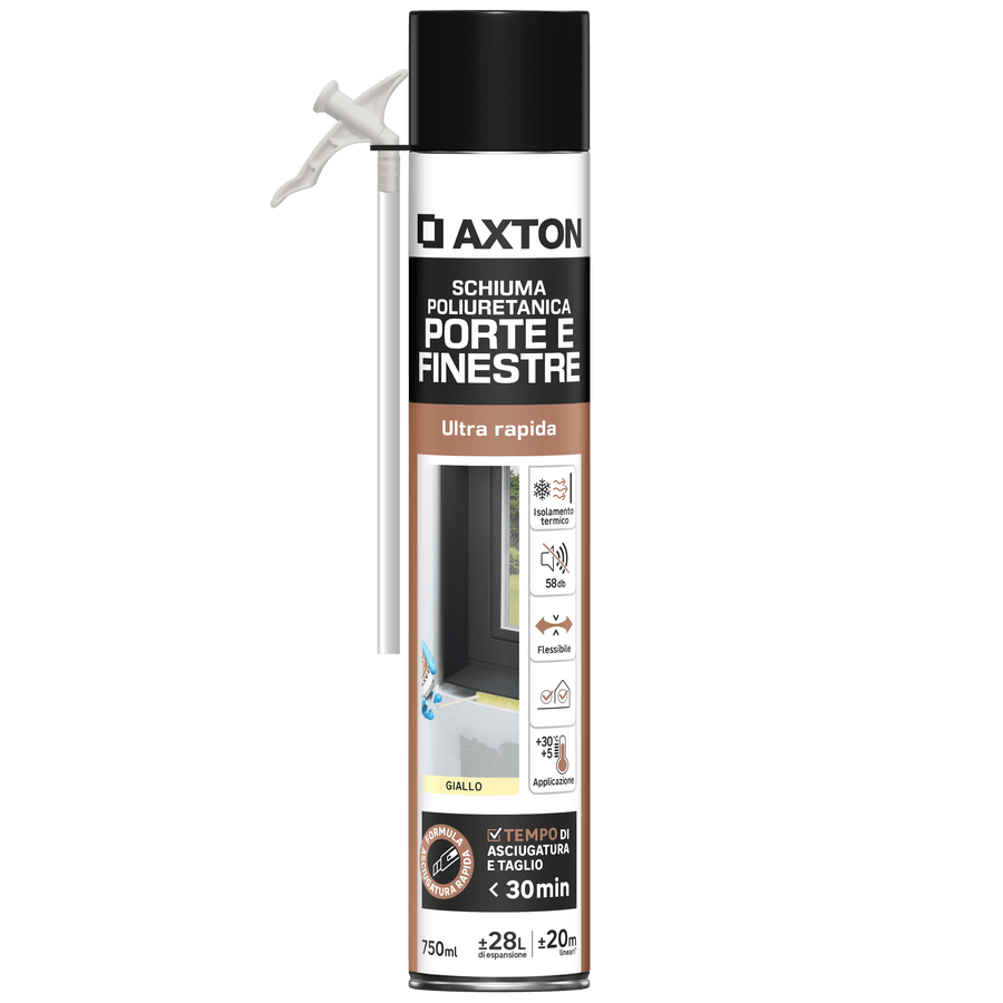 POLYURETHANE FILLING FOAM FOR DOORS AND WINDOWS RAPID POLYURETHANE FILLING FOAM WITH AXTON STRAIN 750MLIt is ideal for insulating and sealing doors and windows since its controlled expansion does not deform the substrateCan be used with most building materials: concrete, wood, cement, PVC... except PE (polyethylene), PP (polypropylene), PTFE (polytetrafluoroethylene).
