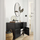 - The two drawers make it easy to keep your belongings organised. The shelves behind the doors give you even more storage space.