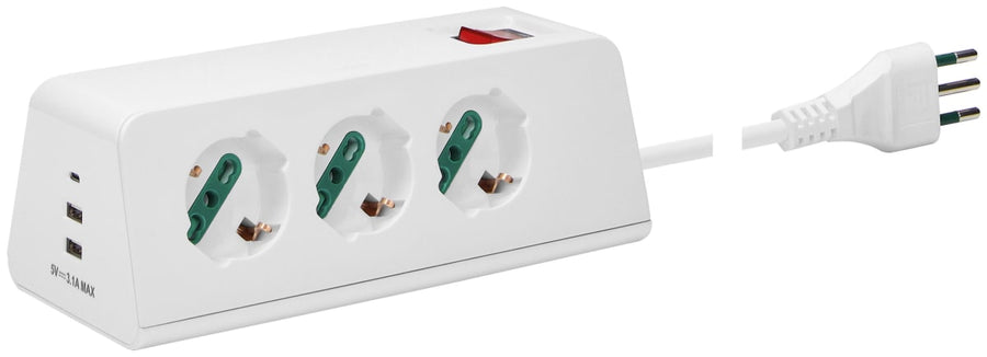 Multisocket usb c bright 3 places, 3 universal sockets, 3 USB, 10 A plug, with 2 m cable, white, VIMARIdeal for use on your desk, at home or in the office, to power all your devicesUniversal sockets suitable for any occasion