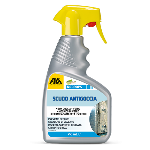 FILA NODROPS SCUDO ANTI-DROPS what it is used for Cleans and protects glass surfaces by making them hydrophilic, water slides off without leaving lime scale. Ideal for shower stalls. ADVANTAGES Easy to apply, does not require rinsing because it does not leave halos, environmentally friendly. Can be used for routine maintenance of faucets, steel elements and plexyglass.