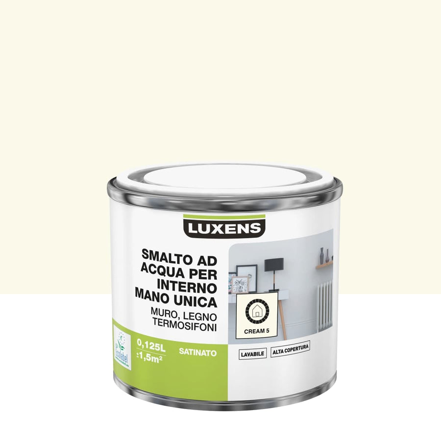 INTERIOR WATER ENAMEL CREAM 5 SATINATE LUXENS 125 MLIdeal for interiors, on wall, wood and radiatorThanks to its quality acrylic resin and creamy consistency, this enamel has high hiding power and is easy to apply.