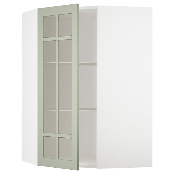 METOD corner wall cab w shelves/glass dr, white/Stensund light green, 68x100 cm