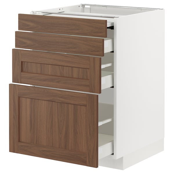 METOD / MAXIMERA bc w pull-out work surface/3drw, white Enköping/brown walnut effect, 60x60 cm