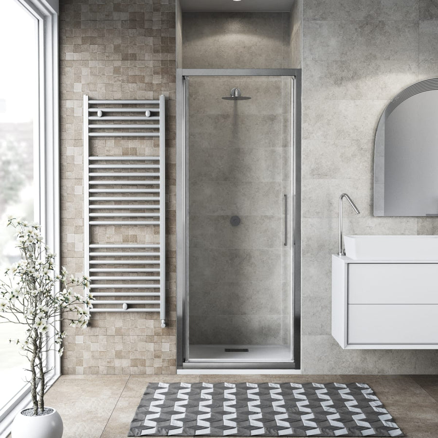 Hinged shower door Record 70 cm, H 195 cm tempered glass, 6 mm thick transparent satin finishIndicated for 70 cm footprintAluminum closing profile ensures less wear and tear than magnetized seals