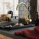 High-arc gooseneck kitchen mixer tap with a tap aerator that generates a smooth flow while enabling water conservation. Match the finish with knobs, handles or other kitchen details.