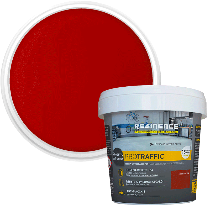 BICOMPONENT RESIN FOR GARAGES AND TERRACES RED TERRACOTTA PROTRAFFIC 500 MLIdeal for heavily used walls and floors such as garages, basements, interiors and exteriors.Resists hot tires, frequent traffic and repeated washing, as well as stains (grease and hydrocarbons)Can be applied without primer to raw or new concrete, tiles or raw or already painted concrete. Car pass after 3 days.15-year hold