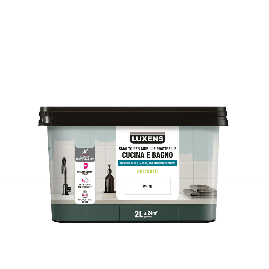 WATER ENAMEL FOR KITCHEN AND BATHROOM FURNITURE AND TILES WHITE SATINED LUXENS 2 LIdeal for giving a new look to kitchen or bathroom surfaces without changing everythingResistant to cleaning and hygiene products (soap, shower gel...).Applies directly without primer