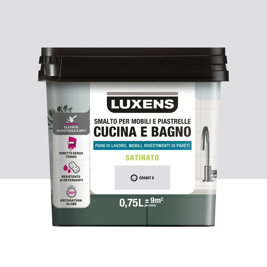 WATER ENAMEL FOR KITCHEN AND BATHROOM FURNITURE AND TILES GRANIT 6 SATINATO LUXENS GREY 750 MLIdeal for giving a new look to kitchen or bathroom surfaces without changing everythingResistant to cleaning and hygiene products (soap, shower gel.).Applies directly without primer